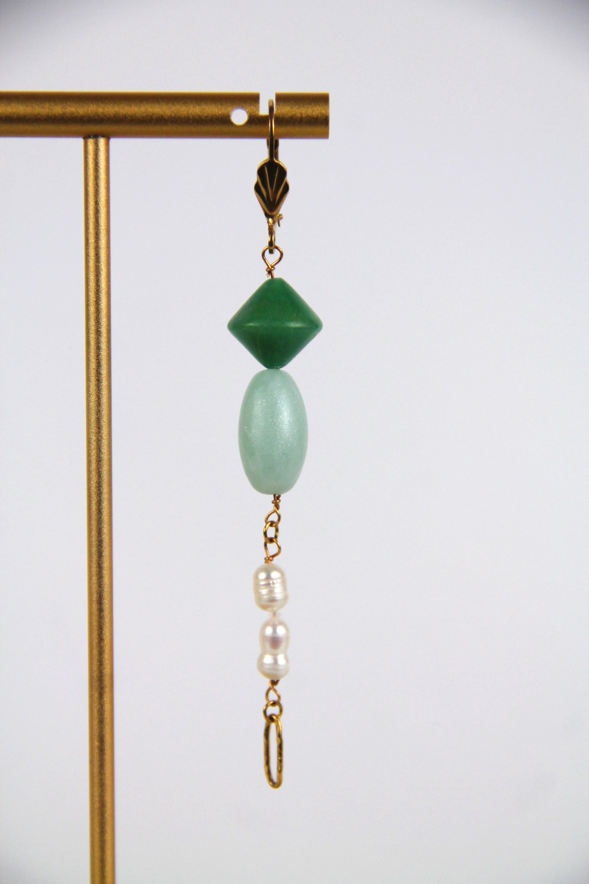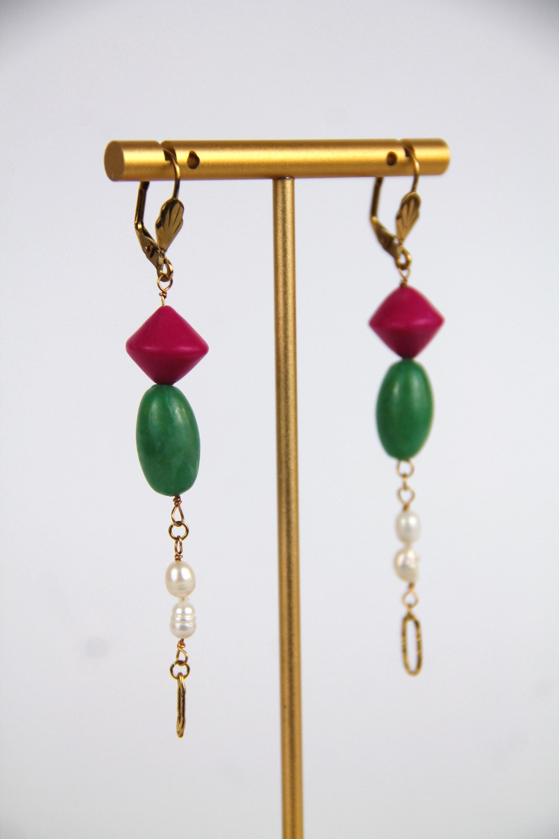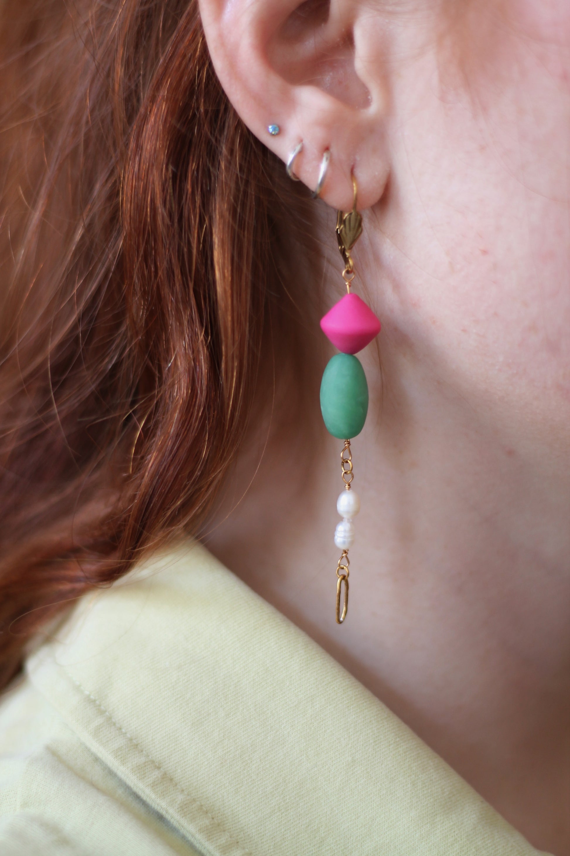 The fashionable ELODIE earrings each feature two genuine freshwater pearls and hand sculpted clay beads in 2 different colors. These earrings are perfect to add a unique touch of colour to your outfit. The combination of the art deco inspired earring hook, the hand shaped beads and freshwater pearls instantly create a contemporary look.